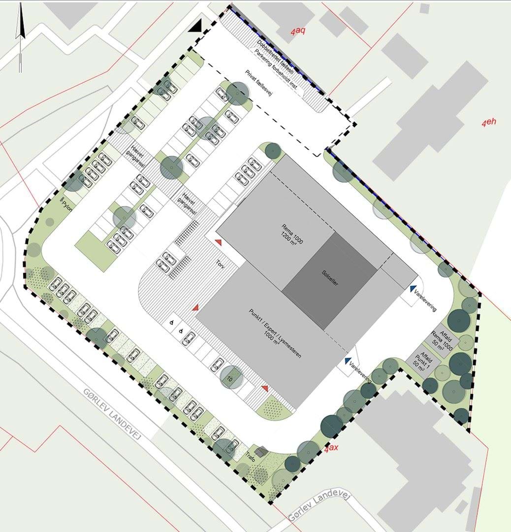 Der udlægges parkeringsarealer i arealet langs med Kirkevangen og langs en del af Gørlev Landevej. Områdets bebyggelse skal placeres indenfor byggefelt i områdets østlige del. Vareleveringen foregår øst og syd om bebyggelsen for at undgå bakkende lastbiler blandt kundetrafikken.