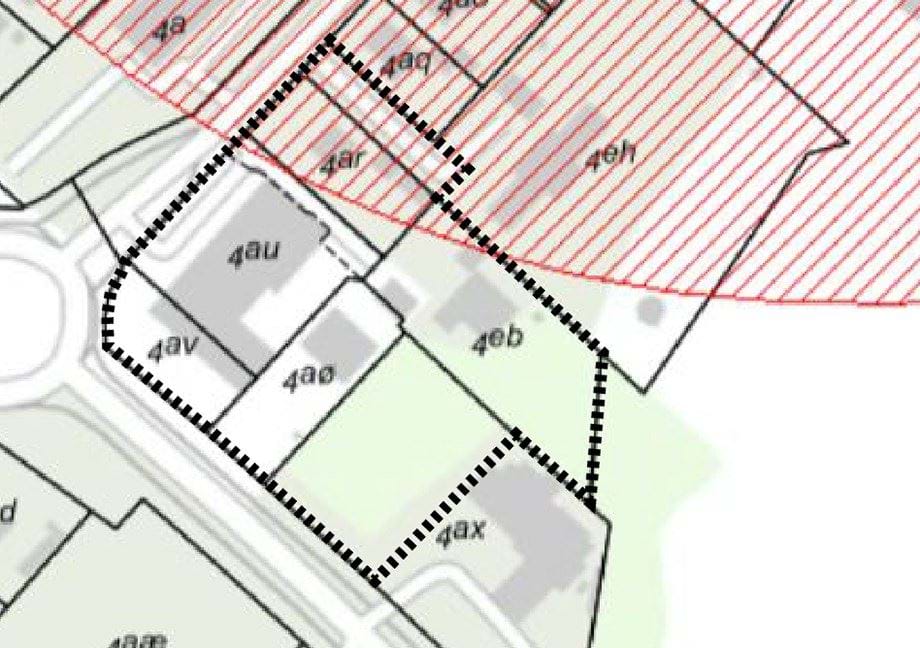 Fig. 5 Kirkebyggelinje (markeret med røde striber, lokalplanafgrænsning er markeret med sort stiplet linje)