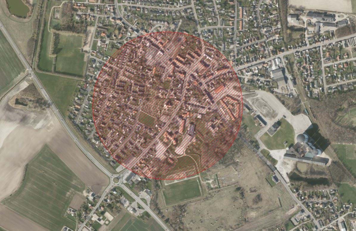 Fig. 6 Kirkebyggelinje ved Gørlev Kirke (markeret med en rød cirkel) – viser beskyttelseszonen delvist er omgivet af bymæssig bebyggelse. Mod sydvest fremstår ingen tydelig bebyggelse.