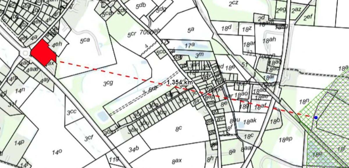 Fig. 7 Lokalplanområders afstand til nærmeste Natura 2000 (Lokalplanområde markeret med rødt felt, Natura 2000 markeret med ternet grønt område og afstanden er markeret med en rød stiplet linje)