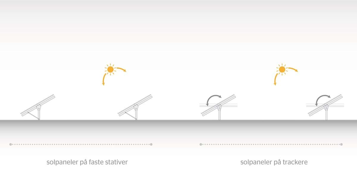 Illustration der viser hhv. solpaneler monteret på faste stativer og stativer der kan vippe efter solens bevægelse fra øst til vest.