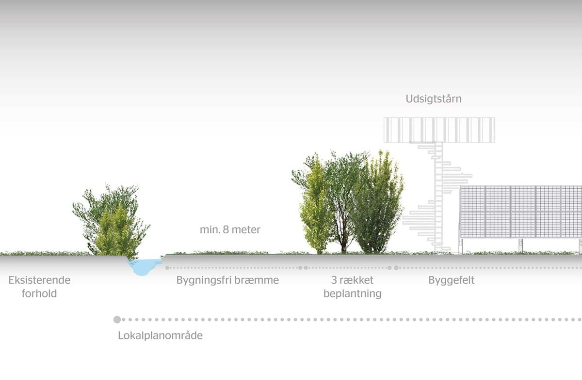 Princip snit der viser den bygningsfri bræmme der udlægges fra det beskyttede vandløb der løber langs den vestlige del af lokalplanområdet. Snittet viser desuden et 3-rækket beplantningsbælte, solceller på stativer og udsigtstårnet placeret i den nordvestlige del af lokalplanområdet.