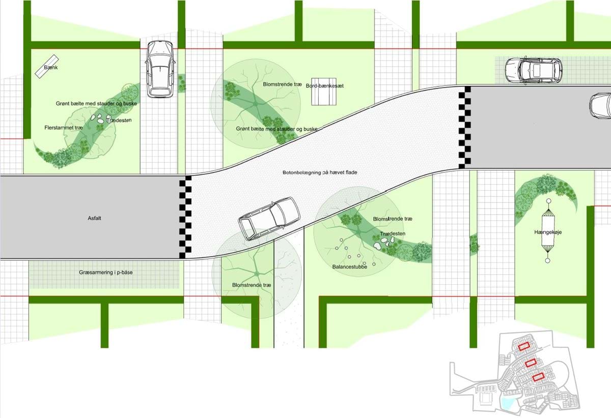I de små intime "lommer" tæt på beboelserne skal indrettes små lokale lommeparker, som kan etableres med eksempelvis bålplads, legeplads, højbede og nyttehaver, som kan understøtte det mere formelle ophold.