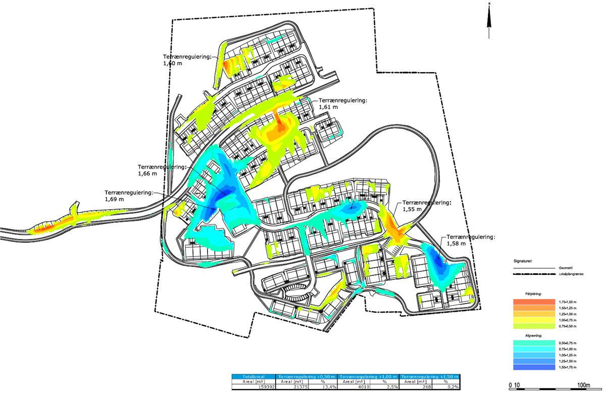 Lokalplanen giver mulighed for terrænregulering i forbindelse med byggemodning af området. Der er udarbejdet en terrænregulerings model i forbindelse med lokalplanen. Der terrænreguleres som udgangspunkt til etablering af områdets veje, boliger, mens de støre grønne fællesarealer fortsat vil fremstå med eksisterende naturligt terræn. Herudover vil der ske terrænregulering til områdets regnvandshåndteringsløsninger. Den maksimale terrænregulering vil være ca. 1,7% og 0,2% af terrænreguleringen vil være over 1,5 m.