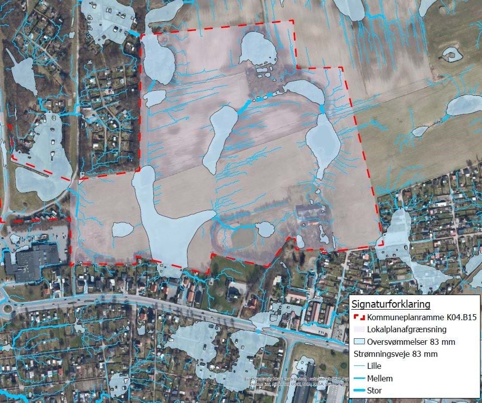 Det ses af denne oversigt at strømningsvejene er stort set uændret ind og ud af området. De interne strømningsveje i området er ændret, men da strømningsvejene ud og ind af området i det store forbliver uændret, vurderes dette ikke kritisk. Lavningerne inden for lokalplanområdet ændrer sig med lokalplanprojektet, hvorfor det sikres, at der stadig tilbageholdes den samme skybrudsmængde som i dag (status-terræn).