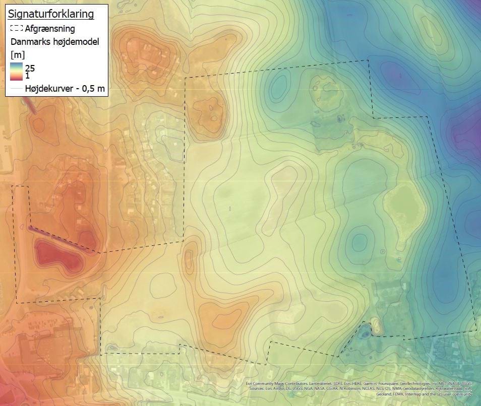 Det ses af nedenstående figur (terræn), at terrænet generelt falder mod vest med en større lavning i den sydlige del af lokalplanområdet. Lavningen strækker sig ud over lokalplanafgrænsningen til et boligområde syd for.