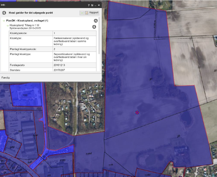 Lokalplanområdet er udlagt til at skulle separatkloakeres (planlagt) i Kalundborg Kommunes spildvandsplan 2010-2015 tillæg nr. 1. I den seneste spildevandsplan fremgår et større kloakopland, som dækker mere areal end hele lokalplanområdet. Se nedenstående billede.