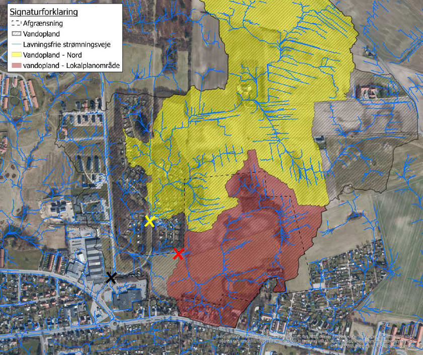 Krydserne viser hvor vandoplandet er taget fra og matcher farven på vandoplandet. Det sorte kryds, og skraveret opland, er vandoplandet til udgangen af kommuneplanområdet ved Lupinvej.
