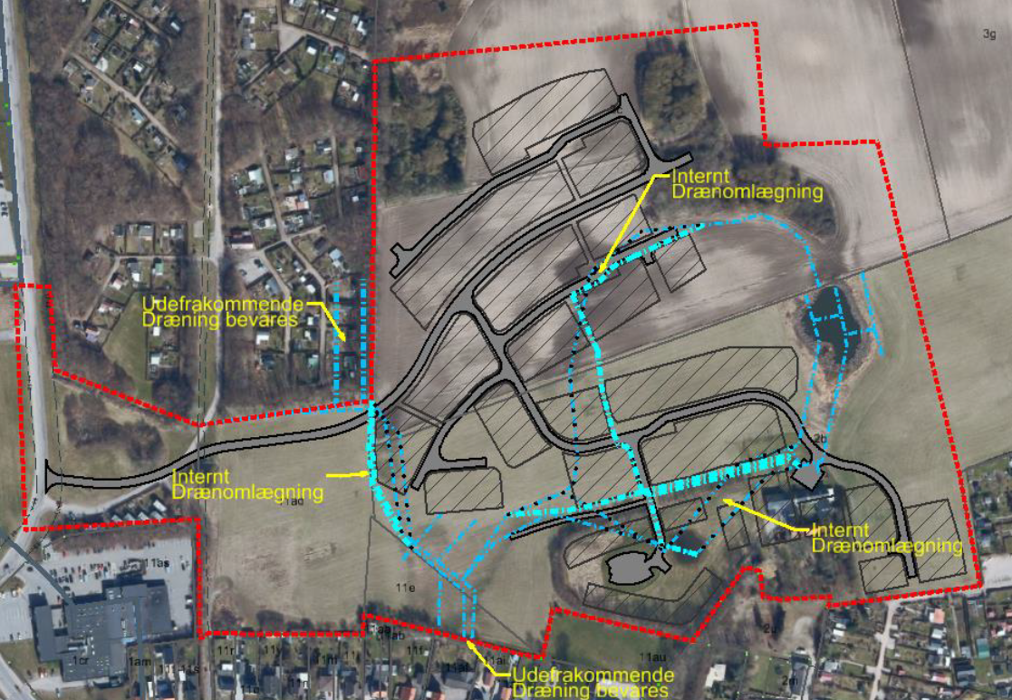 I plansituationen vil man i videst muligt omfang bevare den eksisterende dræning af området. Hvor eksisterende dræn ligger i vejen for planlagte bebyggelser flyttes drænet udenom bebyggelserne. Såfremt man støder på ukendte dræn, der leder ind i projektområdet, skal disse dræn registreres, indmåles og genetableres udenom den planlagte bebyggelse, således afvanding af disse dræn også bevares efter realisering af lokalplanen.