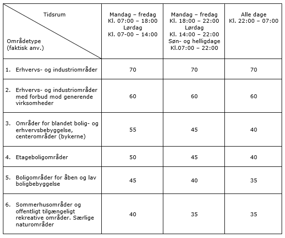Miljøstyrelsens vejledende retningslinjer for støjgrænser fra erhvervsaktiviteter.