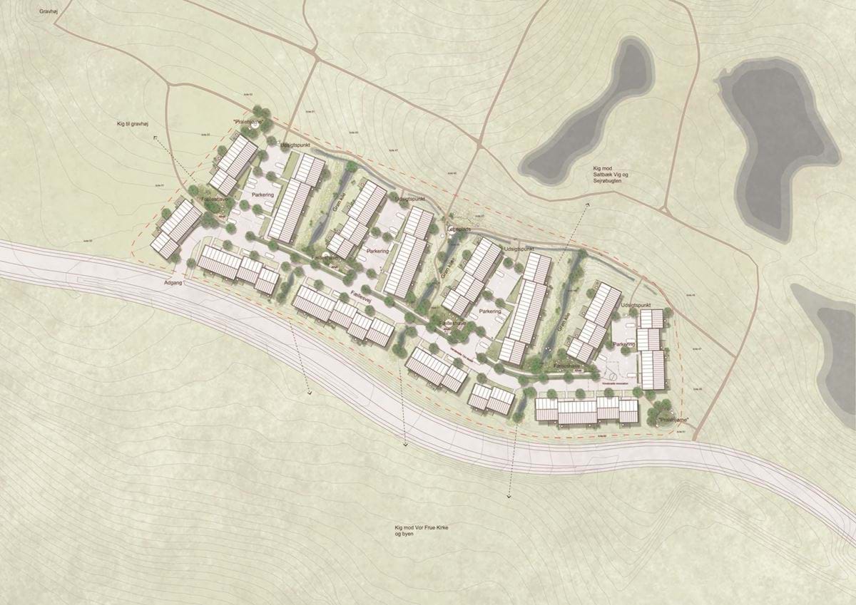 Bebyggelsen lægges som klynger omkring shared spaces med adgangsvej, stier og parkering og adskilles af de grønne landskabskiler. Hermed lægges der op til naboskaber indenfor og på tværs af boligklyngerne. Fællesskabet styrkes af, at der i hver klynge og centralt i området udlægges fælles opholdsarealer og mulighed for aktivitet, ligesom det grønne areal nord for klyngerne samt det sydøstlige hjørne og nordvestlige hjørne (koblingspunkter til omgivelserne) vil have forskellige rekreative muligheder. De grønne kiler, som indeholder LAR-løsninger og rekreative funktioner, lader landskabet komme ind i bebyggelsen samtidig med, at de sikrer kig til vigtige punkter udenfor bebyggelsen, såsom stendyssen (Raklev Vriedysse), Saltbæk Vig og Vor Frue Kirke.
