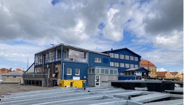 I forgrunden ses det eksisterende havnekontor og bagved det eksisterende pakhus.