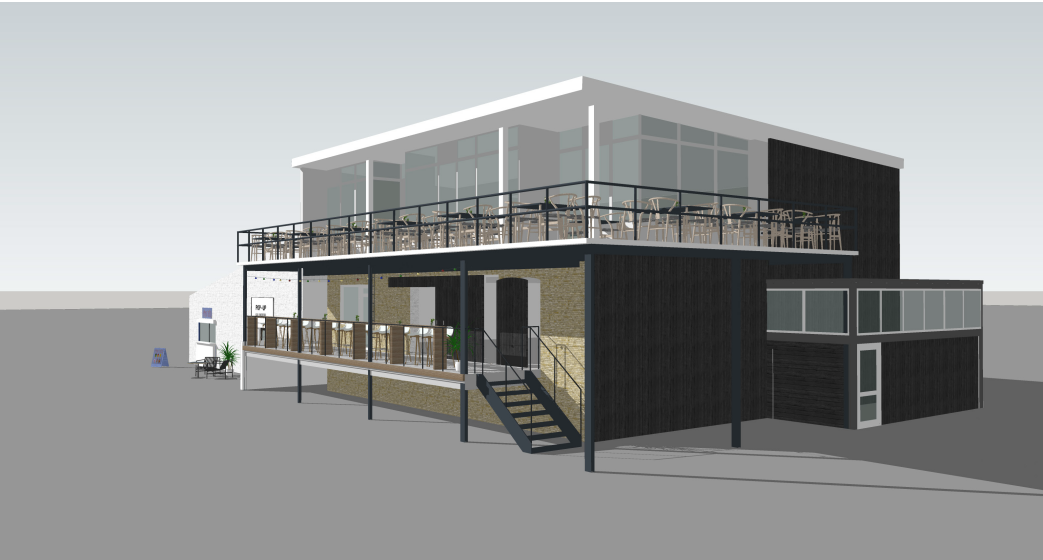 Eksempel på ombygning af tidligere Havnekontor til restauration med udbygget terrasse til udeservering.