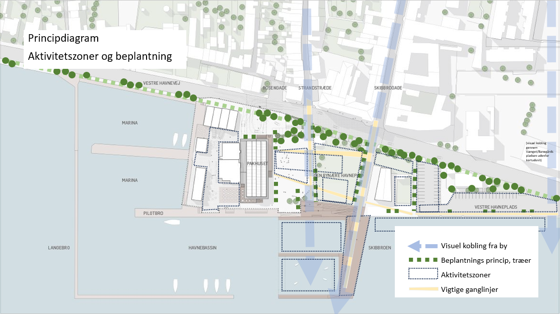 Principskitse for aktivitetszoner og beplantning