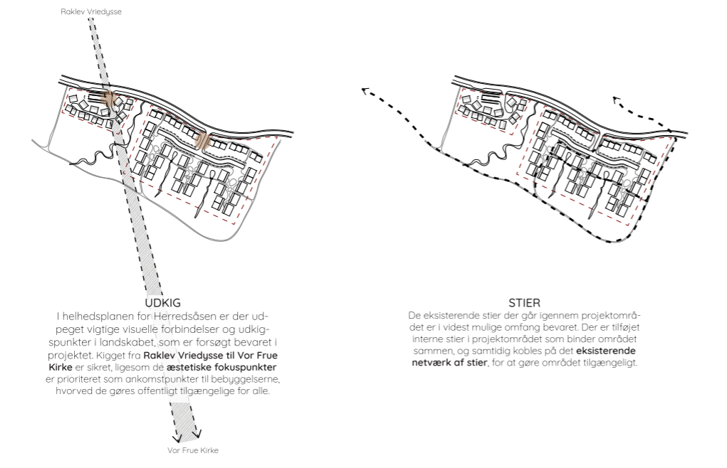 En del af lokalplanens formål er også at tilpasse bebyggelsen efter terrænet og indføre grønne kiler, så naturen og landskabet trækkes helt op til boligerne. Dette for at bevare områdets nuværende naturmæssige og landskabelige kvaliteter, hvor der bl.a. tages et særligt hensyn til det sydvendte, solrige, skrånende terræn og samtidig sikres kig fra stendyssen Raklev Vriedysse mod Vor Frue Kirke gennem området.