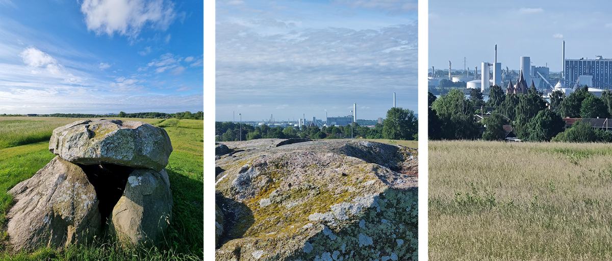 Billeder af stendyssen Raklev Vriedysse, hvorfra der er et fint udkig over landskabet og til byen, hvor bl.a. den femtårnede kirke, Vor Frue Kirke, ses.