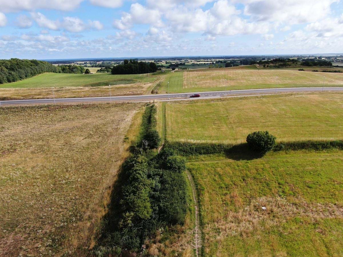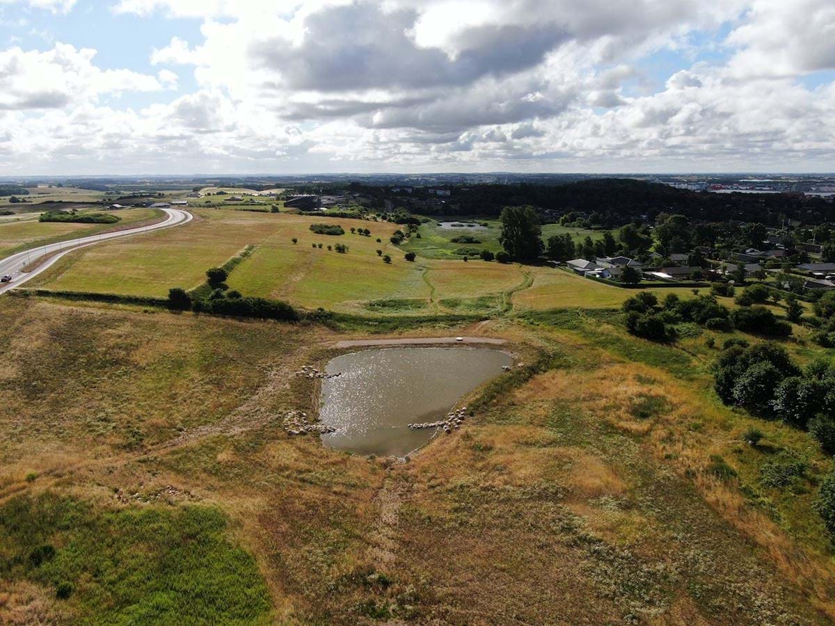 Dronebillede fra sommeren 2020, hvor det beskyttede dige ses i midten af billedet. Til højre for diget ses terrænspringet, en sydvendt side, hvor der er markfirben og tilhørende levesteder. Området syd for terrænspringet friholdes for bebyggelse. Området til venstre er et stort græsningsareal, som ligger uden for lokalplanområdet.