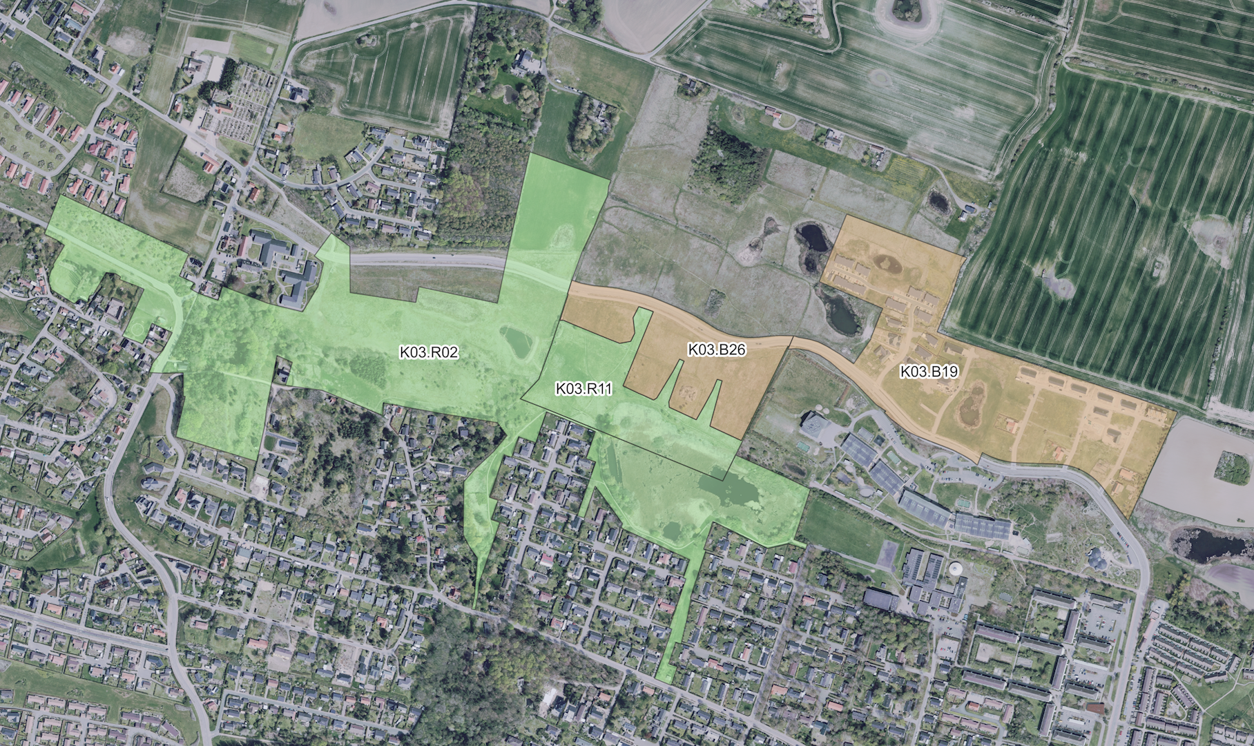 Kortet nedenfor viser fremtidige, nye rammeområder (K03.B26 og K03.R11), og hvordan eksisterende rammeområder reduceres: