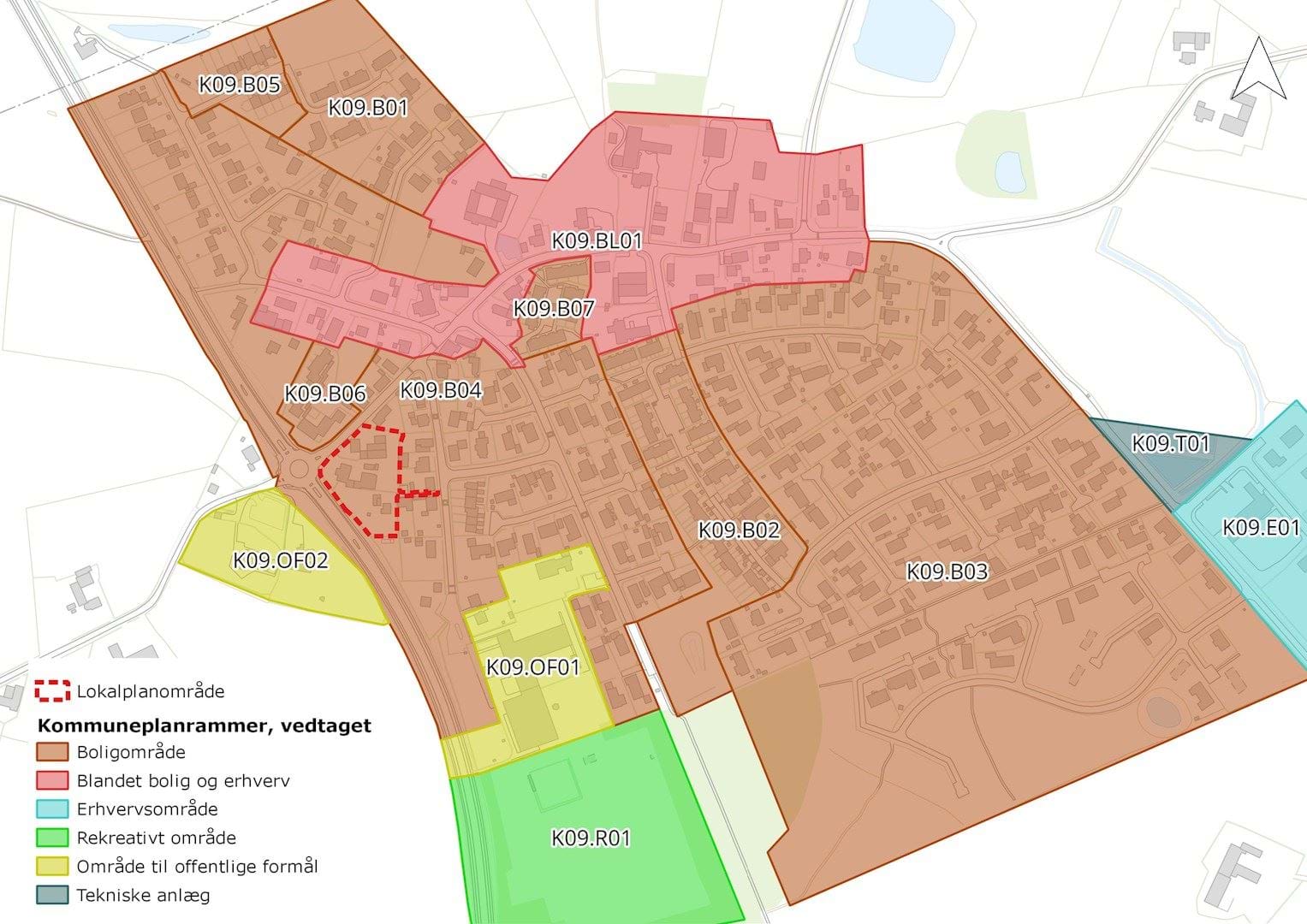 Eksisterende Lokalplanområdet er omfattet af eksisterende kommuneplanramme kommuneplanramme K09.B04 der udlægger områdets anvendelse til boligformål herunder åben-lav boligbebyggelse med en bebyggelsesprocent på 30 og maks. 1,5 etage og 8,5 meter højde.
