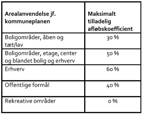 I henhold til spildevandsplanen må der fra områder til blandet bolig og erhverv højst afledes regnvand fra 50% af matriklens samlede areal uden forsinkelse.