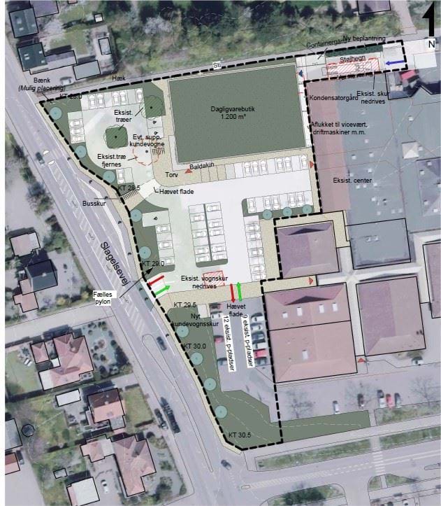 Det grønne ubebyggede areal vest for butikken omdannes til en parkeringsplads som forbindes med eksisterende parkeringsarealer syd for. Den nye dagligvarebutik etableres med samme placering som eksisterende, dog med et større areal. Stien mellem butikken og Høng Centret nedlægges, da udvidelsen af butikken medvirker til en usammenhængende forbindelse.