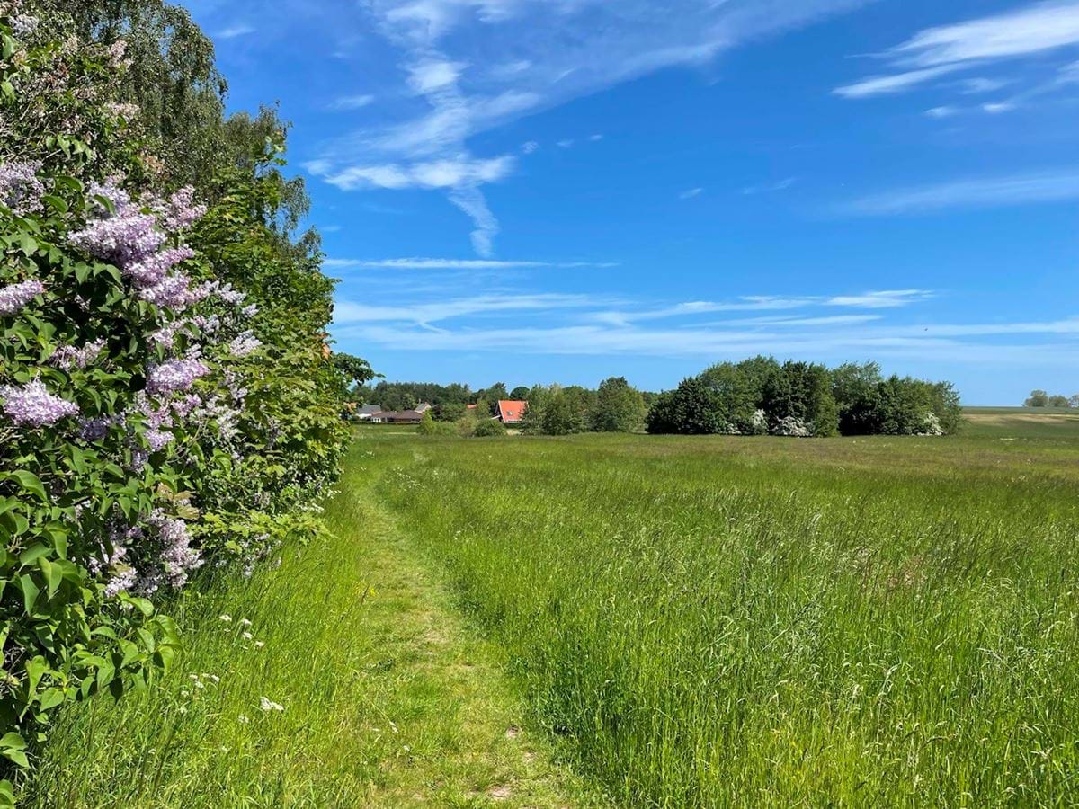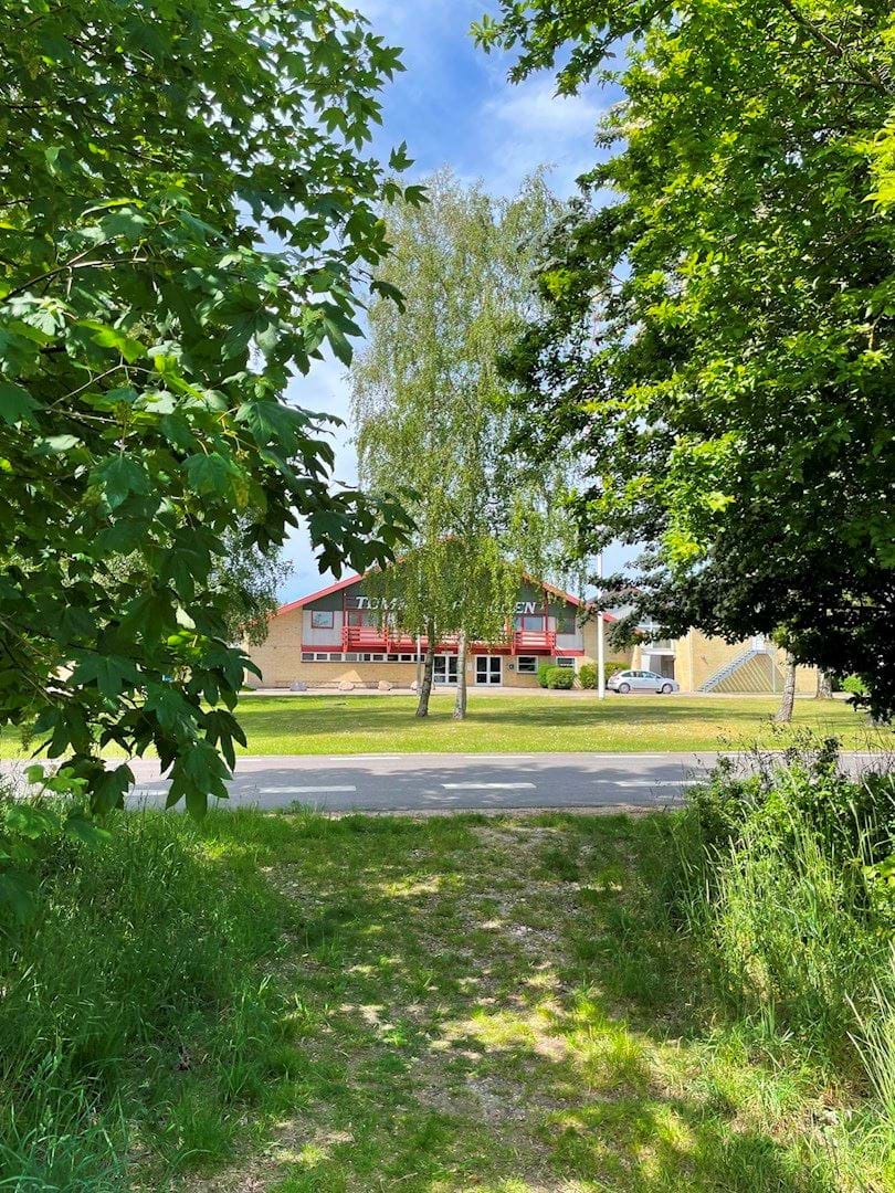Tømmeruphallen set fra lokalplanområdet fra en eksisterende sti mellem Tømmerupvej 31 og 33. Stien fastholdes i planlægningen, da det er en vigtig kobling mellem lokalplanområdet og den eksisterende by.